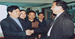 時(shí)任河南省人民政府省長(zhǎng)郭庚茂先生(左)與臺(tái)州商會(huì)支部書記、《百花散》傳人梅安富先生合影